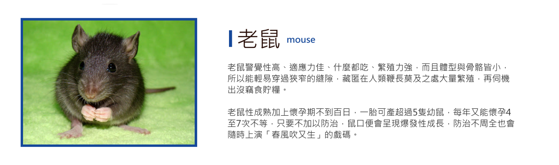 夜習性,老鼠因生性謹慎,大多於周邊較為安靜時進行活動,但若白天就能看見老鼠在活動時,須注意是否環境內鼠量已產生較高密度。