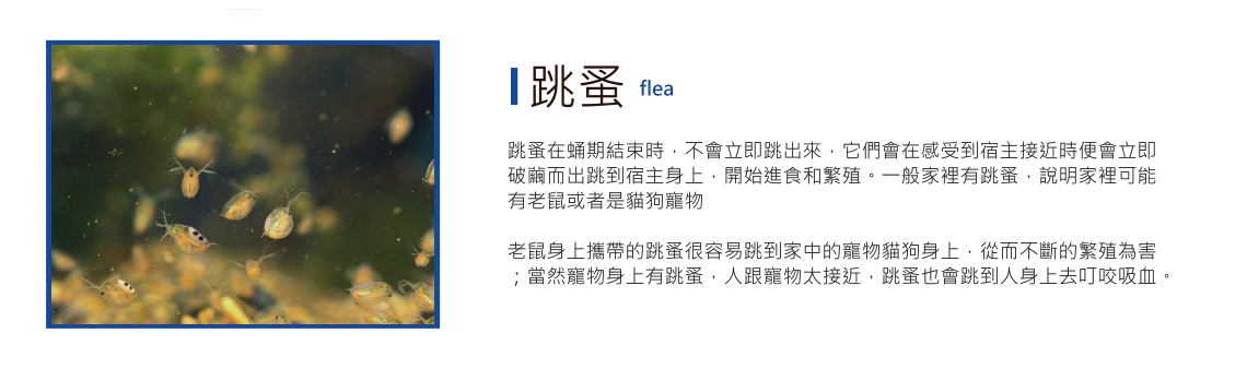 跳蚤是惡名昭彰的環境衛生害蟲,跳蚤和人畜的關係相當密切,可由叮咬、吸血或寄生直接危害到人畜;並可能成為許多疾病的媒介及寄生蟲的中間的宿主,造成更嚴重的危害。